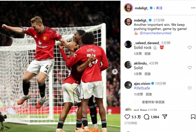 德里赫特社媒晒庆祝照:又一场重要胜利!我们继续齐心协力!